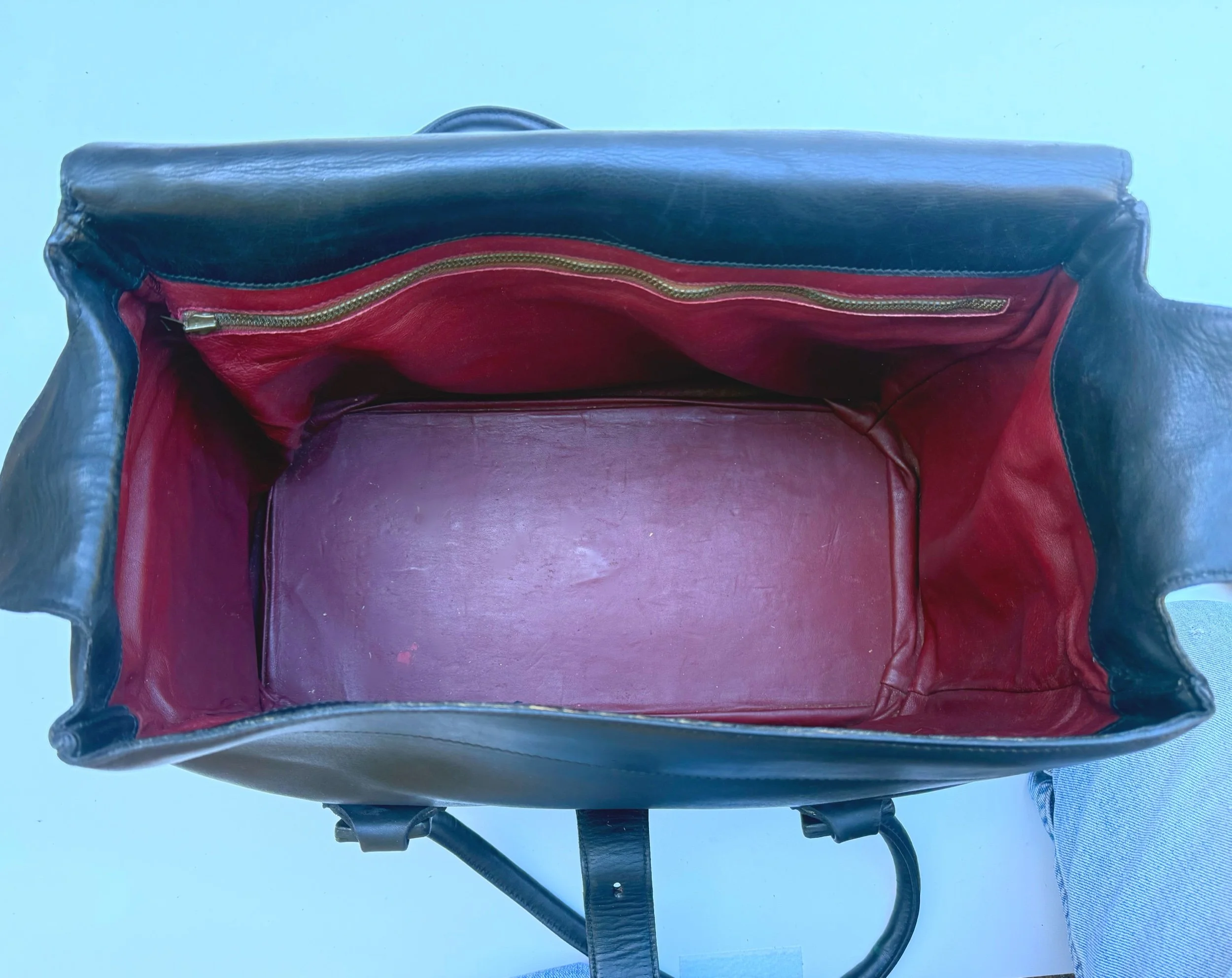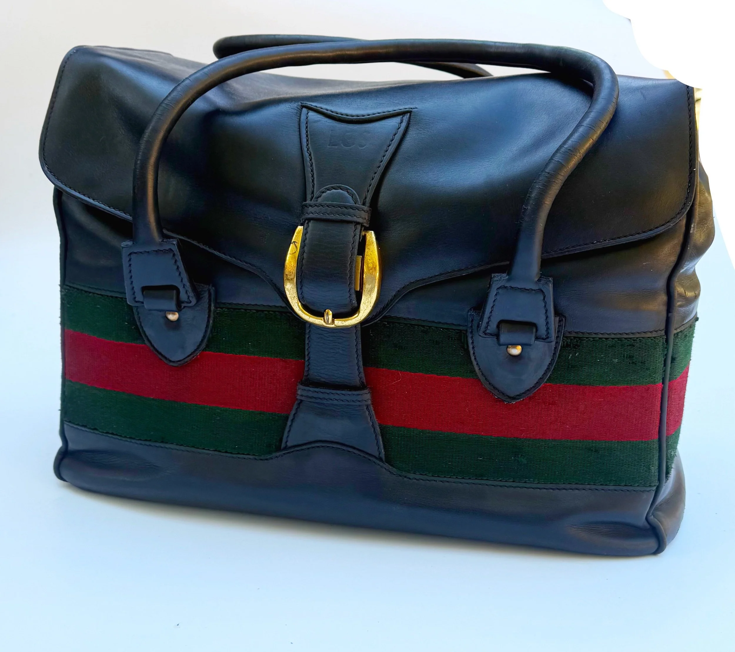 Ultra rare all leather Gucci Weekender bag. She has been lovingly cleaned and restored. This all black leather tote bag measures 13” tall and 18” wide and 9” deep. She has 2 all leather handles for carrying. Her gold tone lock is embossed with Gucci but does not have a key. Her interior is a dark red wine lambskin leather with zip pocket. She holds a capable 2 nights clothing and essentials. Her front leather flap is faintly embossed with the original owners initials. Her iconic webbing is bright and been refreshed. There had been some moth damage (see photos) but the damage had been sealed from further issues and has been redyed and sealed. This is a chance to start off with luxury! Makes a great fathers gift.