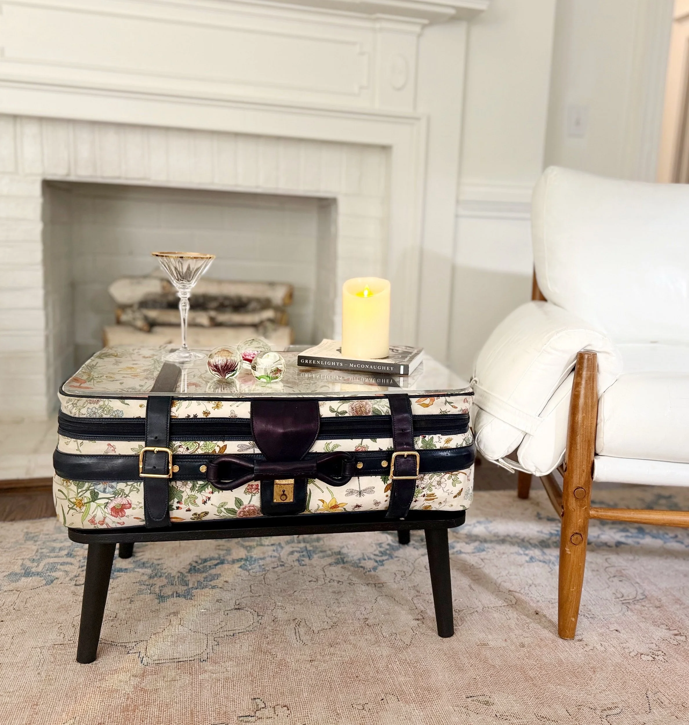This authentic Rare Gucci Flora suitcase has been given new life. Her interior has been resealed and cleaned. Her exterior Flora canvas has some light fading and wear. I didn’t clean the canvas as I wanted her to look like she has wonderful travel stories to tell. She sites on a black table base and she measures 18” front to back and 27” wide. The table and suitcase measure 18” tall . I cut a piece of thick acrylic as a top but a glass piece would be better. But for shipping reasons, I have included the acrylic top. She comes with the base and acrylic and the suitcase is prestuffed to hold its shape.