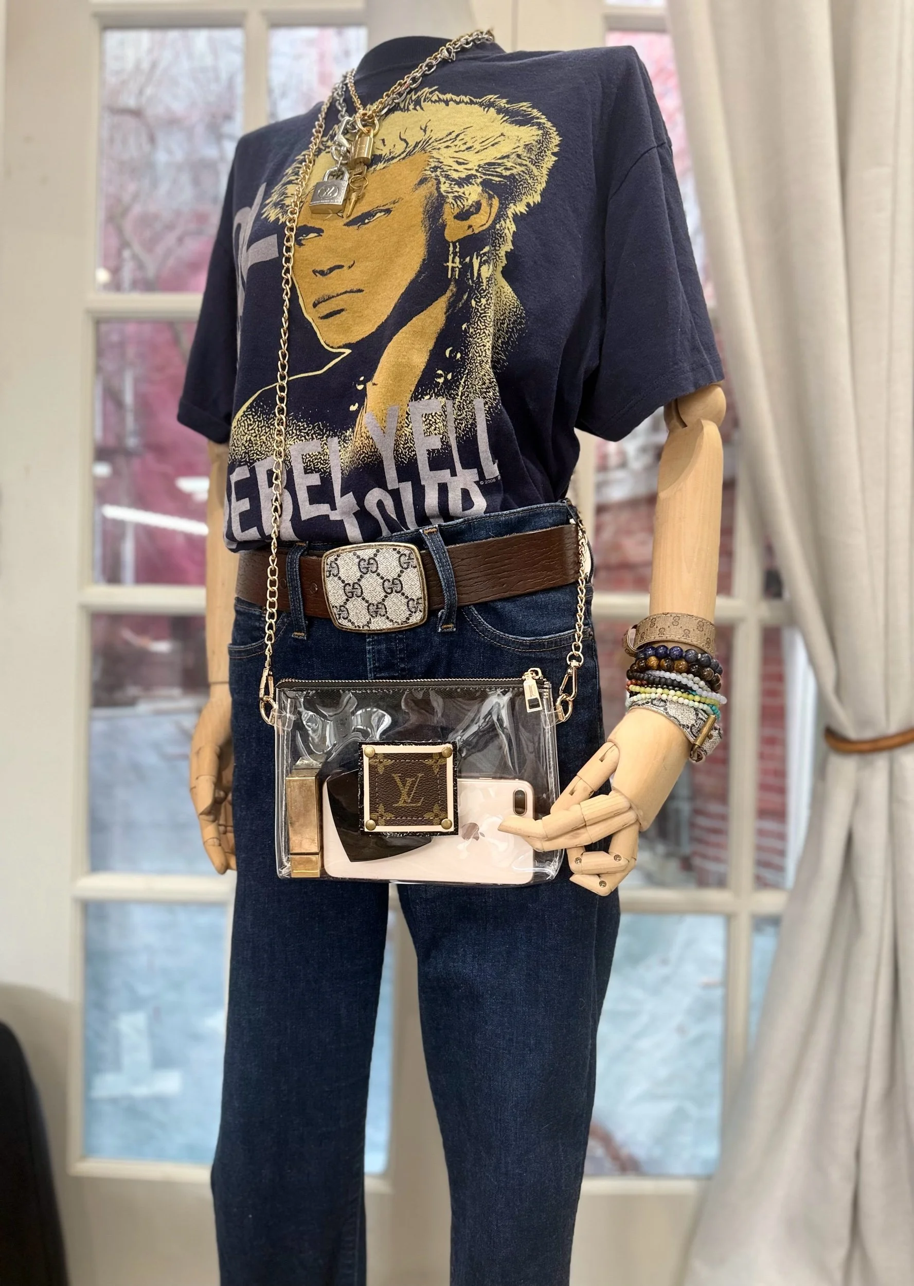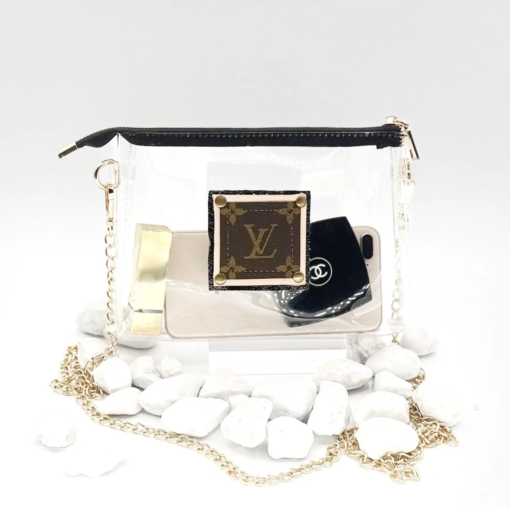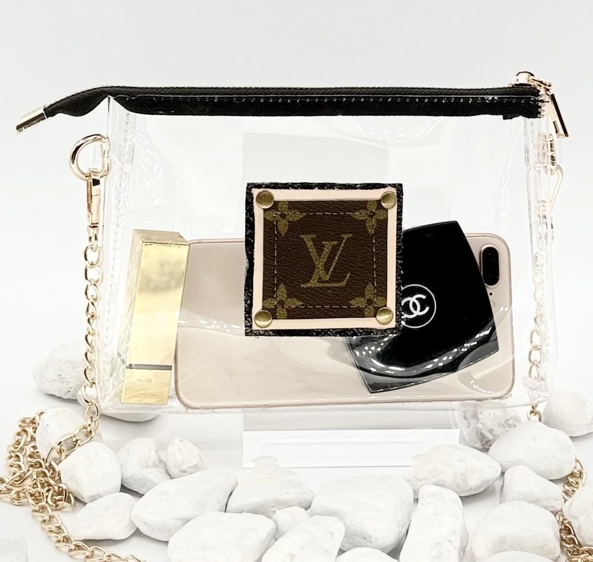 Need a acceptable bag for that stadium game or concert? Do it with style. This clear crossbody stadium bag is always approved! She measures 8 1/2” x 1” x 6” with a black zip closure. Her front sports a harvested canvas logo backed in vachetta and black leather, machine stitched and riveted. Not to big but spacious enough to hold wallet, keys, cosmetics, sanitizer sunglasses and so much more. She comes with a gold tone chain strap measuring 49”. Feel free to ask about a custom strap to make her your own style! Ready to ship